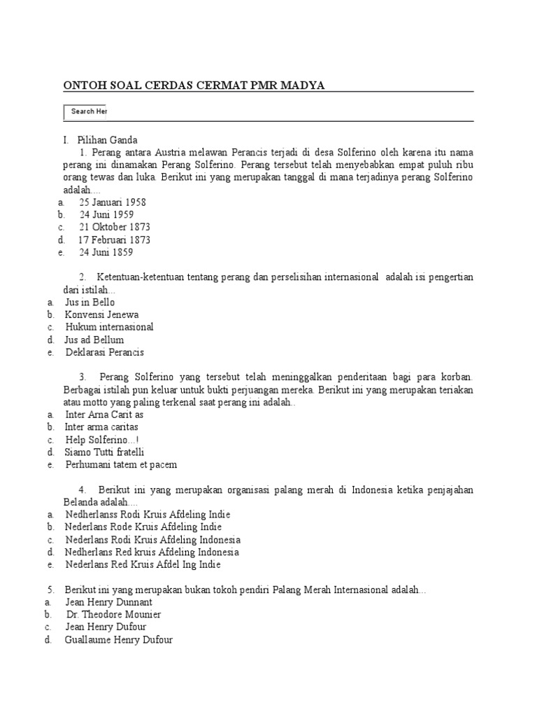 Soal Lengkap Jumbara PMR Tingkat Madya 23 Sep 2016 Post a Comment SOAL TEST TERTULIS SELEKSI JUMBARA PMR TINGKAT NASIONAL 2011 Tingkat Madya 1. Kumpulan Soal Lomba PMR Madya Download Kumpulan Soal Lomba PMR Madya Fajar Martha Peran yang muncul berdasarkan jenis kelamin dan tidak dapat dipertukarkan disebut. Nomor 2 itu jawaban nya A pada tanggal 22 Agustus 1864.
