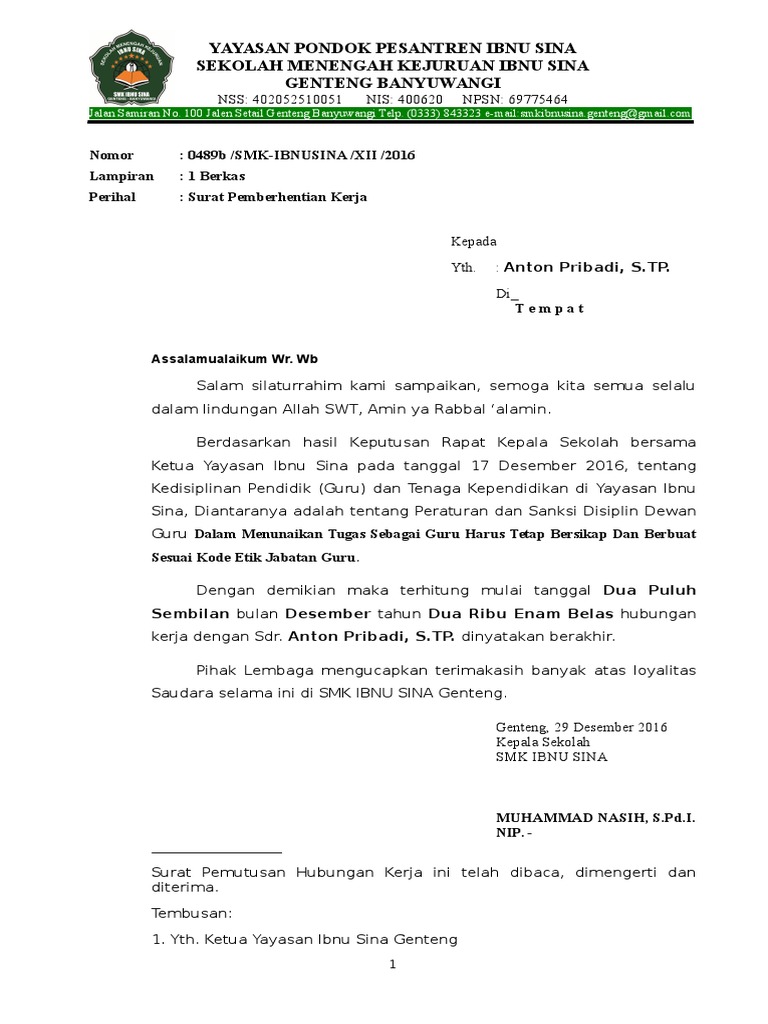 Contoh Surat Pemberhentian Kerja Guru Dari Kepala Sekolah